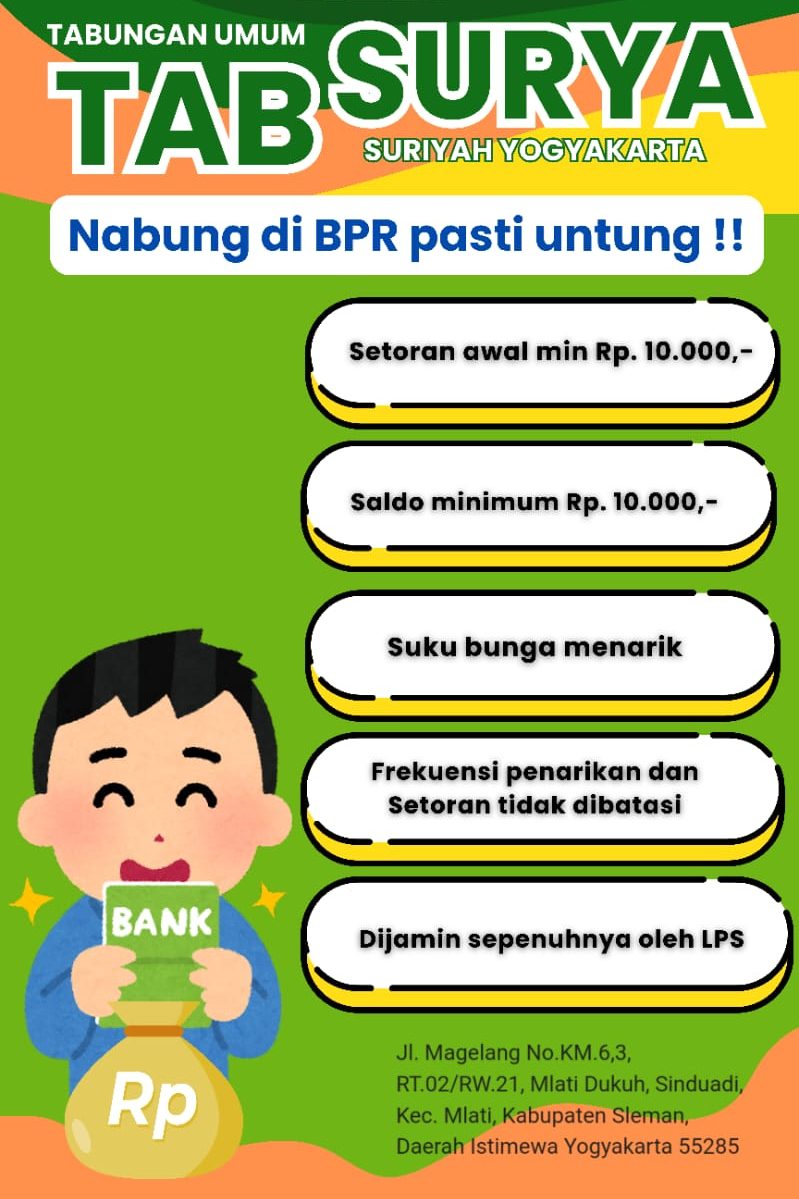 Tabungan SURYA adalah tabungan umum yang kami sediakan bagi para penabung dengan berbagai rencana kebutuhan dimasa depan dan keuntungan berlipat.